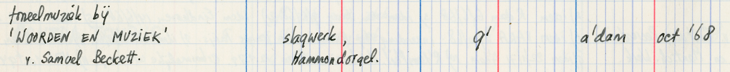 | Toneelmuziek bij 'Woorden en muziek' v. Samuel Beckett : voor slagwerk, hammondorgel | manifestation |